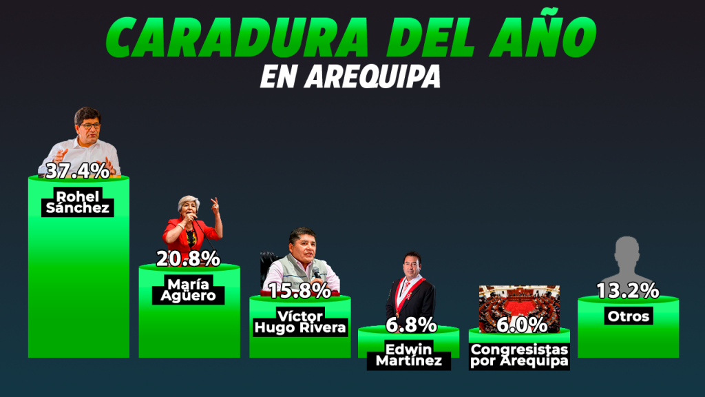 En la encuesta por el Caradura del 2024 en Arequipa, el primero en el podio fue el gobernador regional Rohel Sánchez con 37.4%. La autoridad estuvo elonvuelto en denuncias sobre presuntas irregularidades que involucran a su entorno familiar y ausencia de obras de envergadura.
