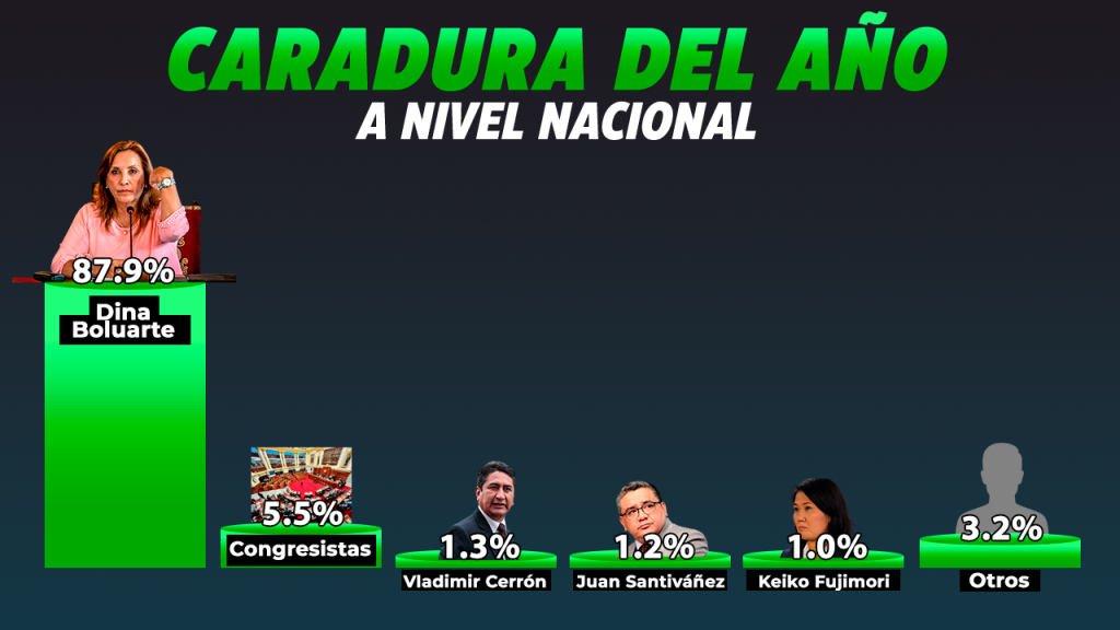 El Caradura del año destacó por sus actos negativos.  En esta oportunidad, la votación para el personaje a nivel nacional fue contudente y el primer lugar lo obtuvo la presidenta de la República, Dina Boluarte con 87.9%.