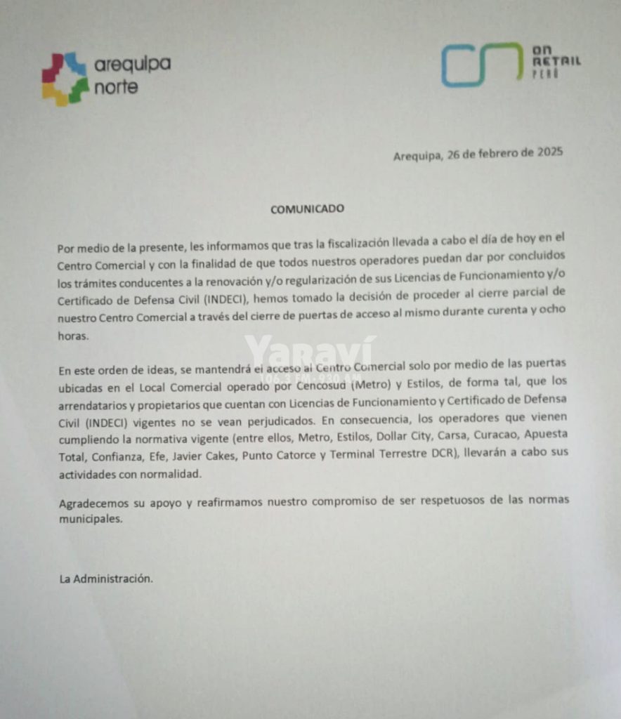 COMUNICADO DE PLAZA AREQUIPA NORTE